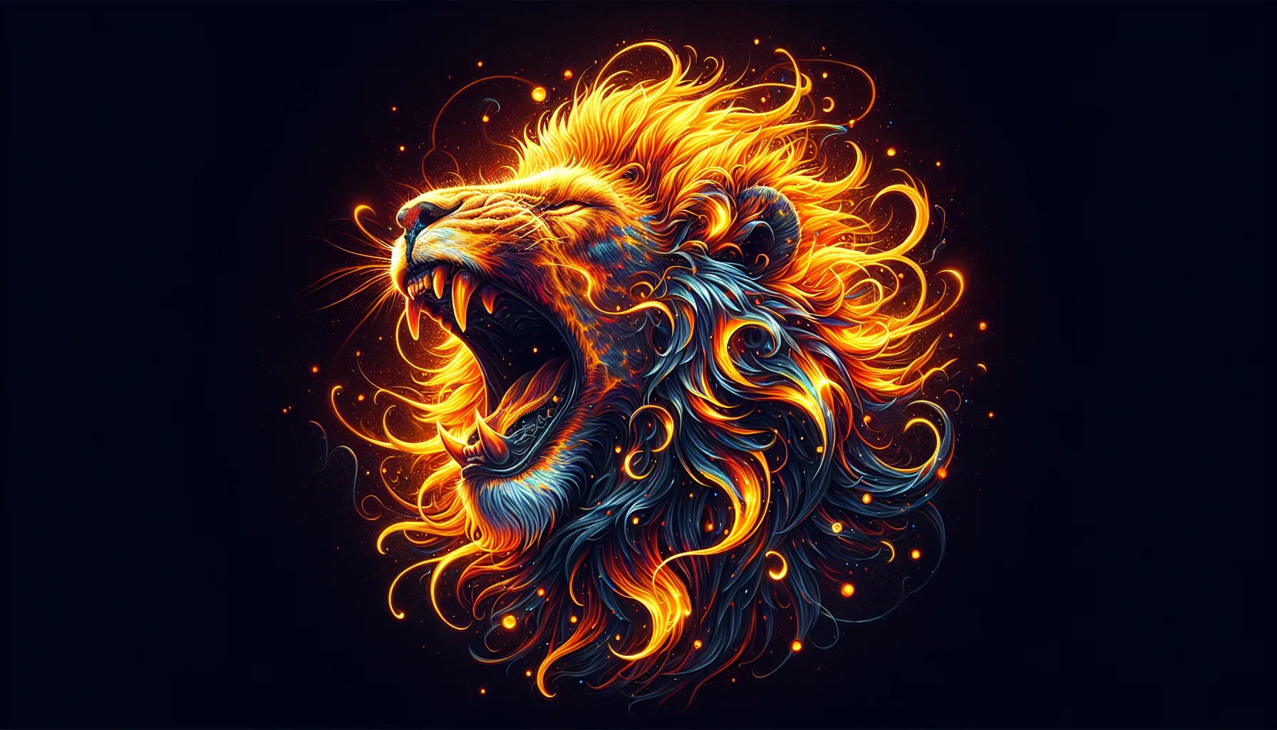 Neon-orangene Flammen-Mähne vor tiefem Schwarz. Digitale Malerei mit Lichtpartikeln und fließenden Formen — ein Galerie-Stück, das den Betrachter fesselt.